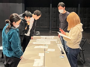 翻訳された日英のテキストを軸に二国間の文化・言語・身体的な相違を再発見し、その問題点を洗い出すことにより参加者と共に多くの実験を繰り返すことができた。本番に向けた稽古ではなかなか実施できないトライアンドエラーが実現できたことにより、2024年2月26日~3月8日に横浜で行われたクリエーションにおいて、今後の創作へ向けての豊かな時間となりました。